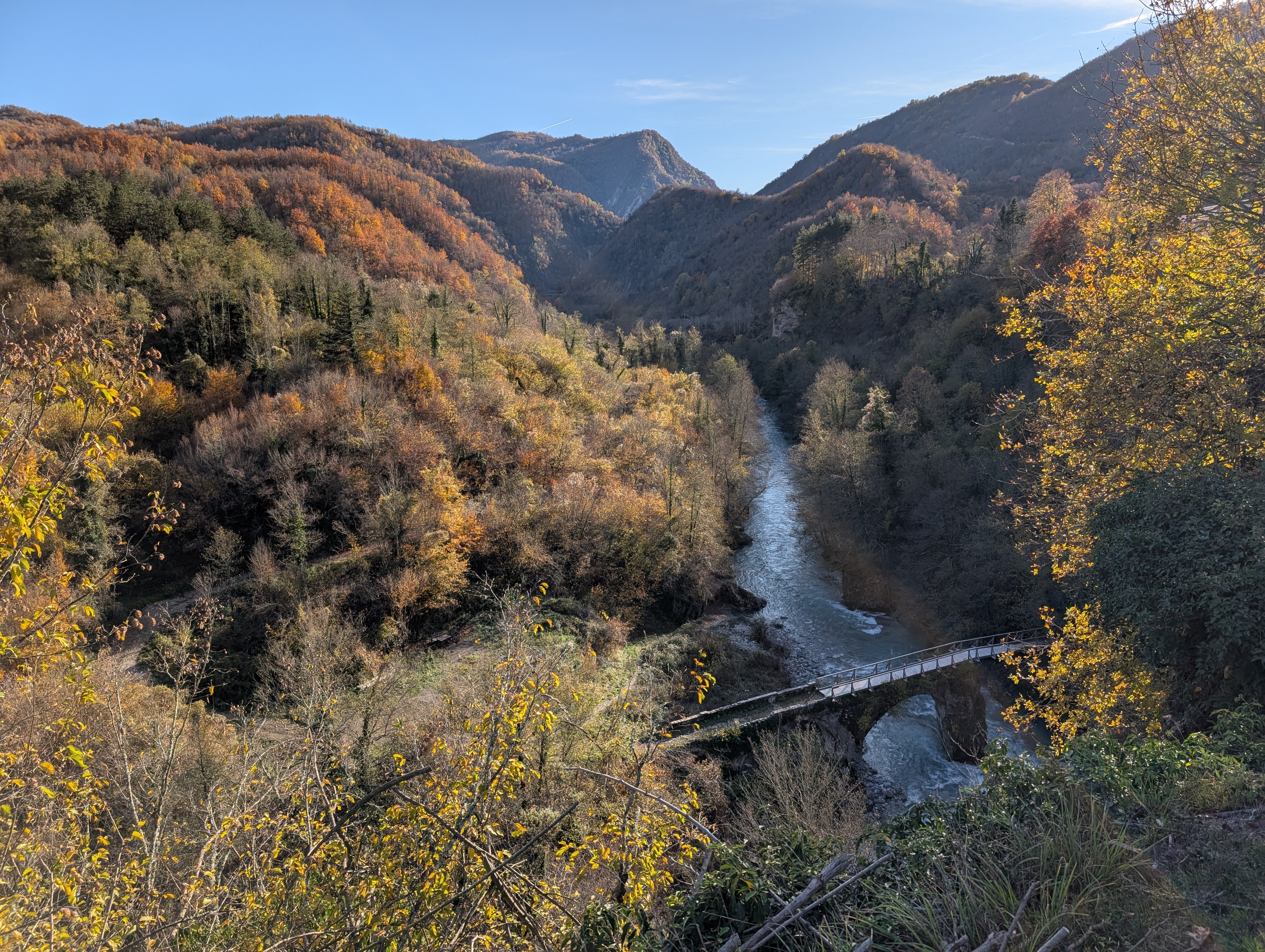 13 November 2025 - Podgorica I'm at the airport two hours early of course. I dropped off the little car which I've driven throughout the country. I checked my bag and carried liquids through security for the first time in decades. Like everything else EU, Montenegro has just adopted this rule too. TGD is the abbreviation for this airport, which makes no sense for Podgorica until I discovered that the city was called Titograd for the better part of the twentieth century. The airport is tiny and reminds be of Tyson-McGhee back in Knoxville. Based on the number of other people in the airport my flight back to Zürich will probably be as empty as the one coming here. Yesterday I did an insane amount of driving, starting in Žabljak. I crossed the Tara Canyon on a rickety old bridge undergoing repairs. It's the largest canyon in Europe and quite impressive. I assumed that the Tara River flows out of the mountains, but I later discovered that in fact it goes the other way, flowing north into Bosnia and Hercegovina and eventually into the Danube and the Black Sea. Such a river must have been here long before the mountains were uplifted, which is why it held it's path and just carved right through them as they rose. Sadly I could not drive through the canyon because the road was being repaired so I took a more northerly route that Google Maps recommended through cow country. Unfortunately this road was also undergoing construction and I soon reached a nice new bridge that was not finished yet. One of the workmen told me that I could follow a cement truck to the path around the bridge. So off into the woods along a one lane dirt road I went. Soon I passed the cement truck on wide spot and found myself going down a steep grade along the edge cliff. I took a wrong turn and ended up on a farm, so I had to backtrack until I found the cement truck again. Then it was up another steep cliffside and back to the road on the far side of the incomplete bridge. Phew! There were many small valleys with farms and towns along the way, until I suddenly hit a real divided highway in the middle of nowhere. There was a sign crossed out going to Belgrade with cones blocking the entrance, but the other way to Bar/Podgorica was open. This was the famous Bar to Belgrade highway financed by the Chinese Belt and Road Initiative that nearly backrupted Montenegro and actually just goes from nowhere to nowhere atop the mountains through tunnels and bridges. It's faster than the road through the Morača Canyon that it runs roughly parallel to, but the toll of 3.50 euros one way means the truckers drive through the canyon instead. At least the far end of it drops one near Podgorica. I had wanted to see the Morača monastery in the canyon though, so I had to backtrack. The drive through the Morača canyon is another terrifying one, like driving down to Kotor from Cetinje. It's a two lane road, but often with a small rock barrier on the edge of a cliff with the river several hundred meters below. Still, worth it to see the 13th century monastery with waterfall and old stone bridge. Then I felt like some more hiking, so I stopped at the Mrtvica Canyon which featured another stone bridge, although newer from the 19th century. The sun was going down and had already set in the canyon though, so I wasn't able to do the full hike. Reaching my hotel by the aiport I got dinner and crashed hard into bed.