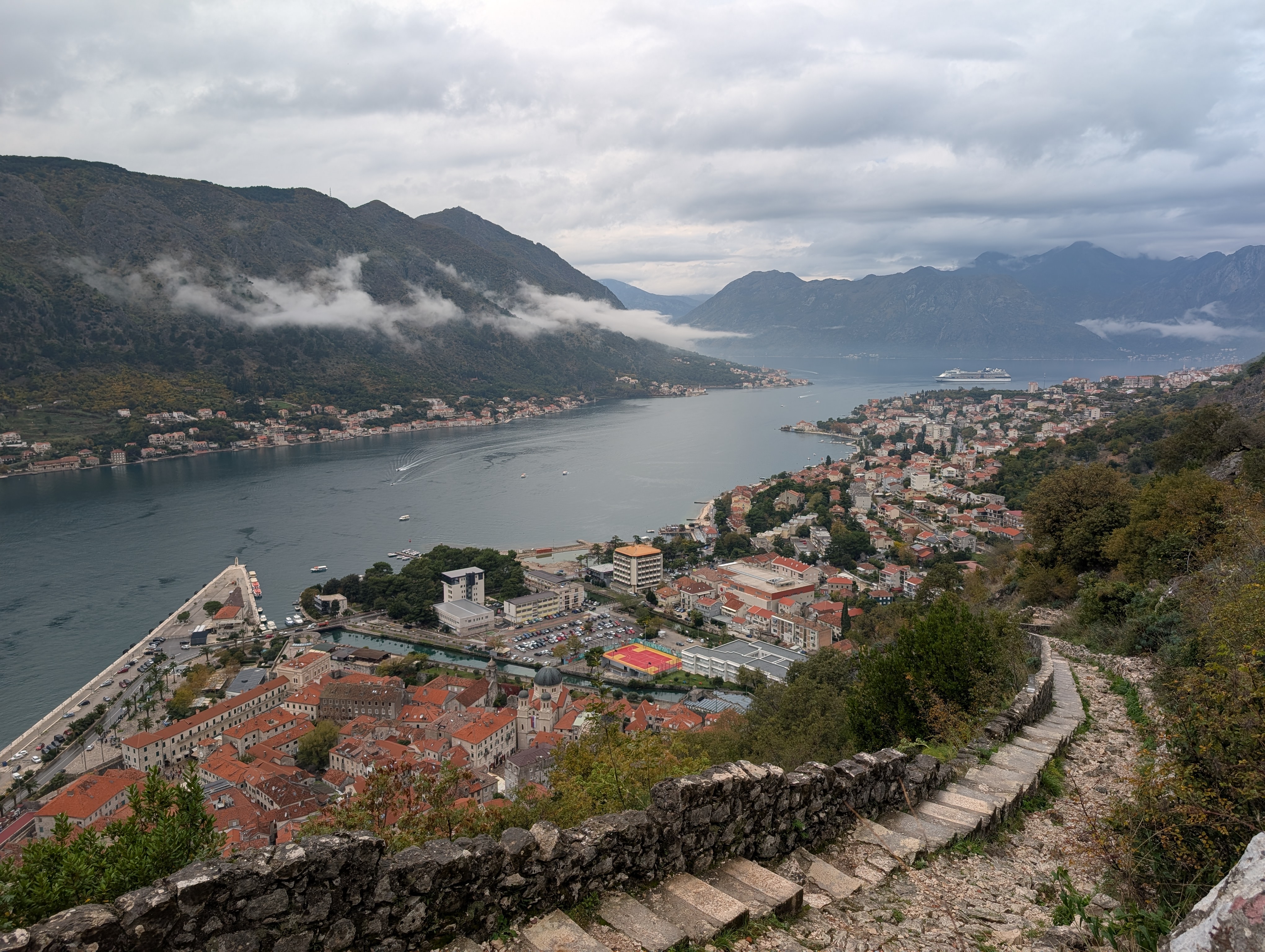 7 November 2025 - Kotor Today, after spending the morning visiting the old walled city of Budva, we visited the more famous creation of the Venetian Republic during its heyday, Kotor. It is also a walled city build on the bay of the same name, but much larger. In those days it was called Cattero. And, in addition to city walls, they built fortifications more than 1000 feet up the steep mountainside behind the city. Today I climbed this wall, the Ladder of Kotor, and it is definitely one of the coolest castles I've seen in Europe.