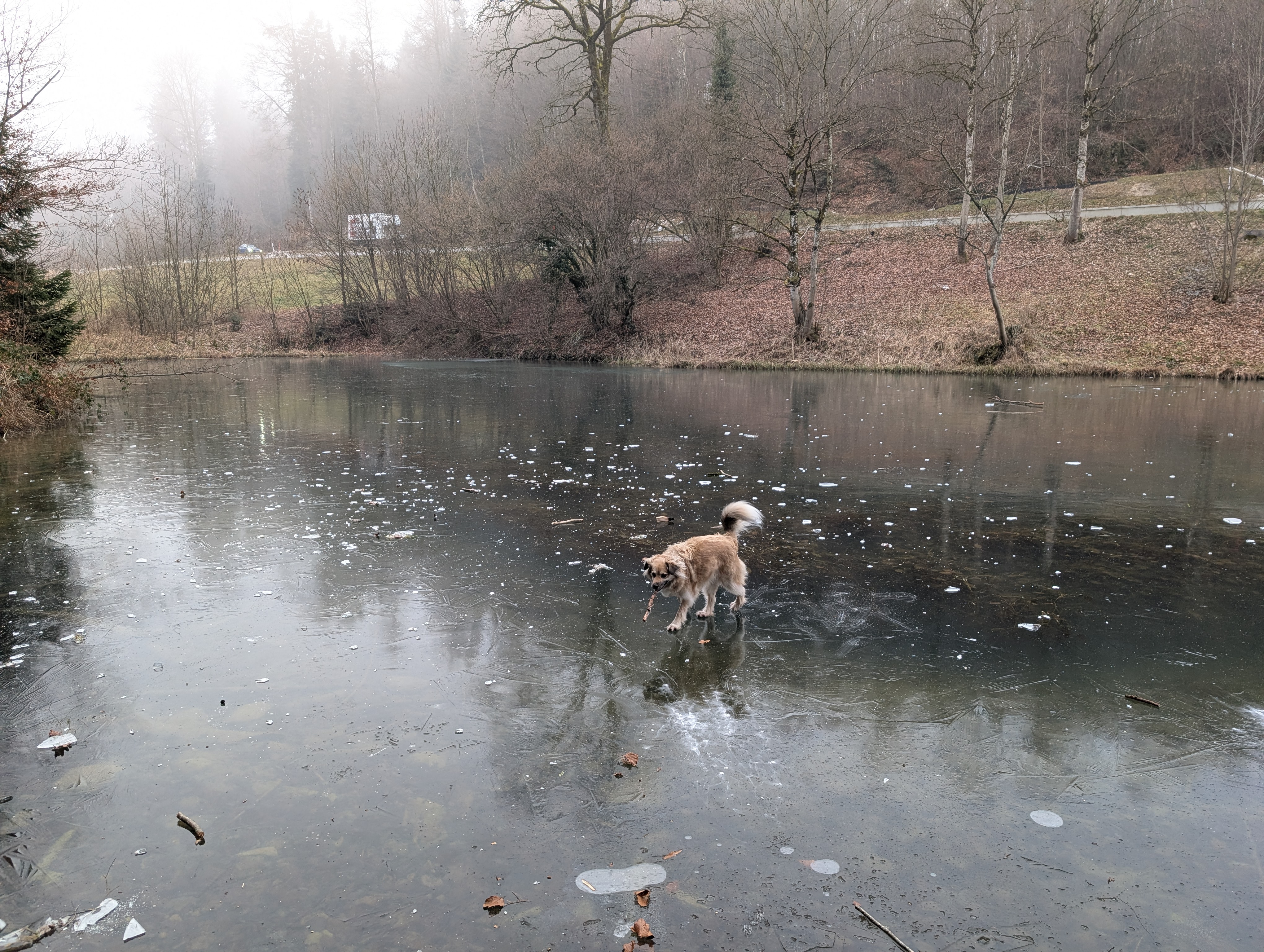 It's been a fairly dry December, but at least it's cold enough for things to freeze. Paula is somewhat fearless going out on the ice considering that it was thin enough on this lake two days ago for her to break through. But she is mostly fur after all. And even in the freezing weather her and Eddie are happy to swim in running water for fun. |