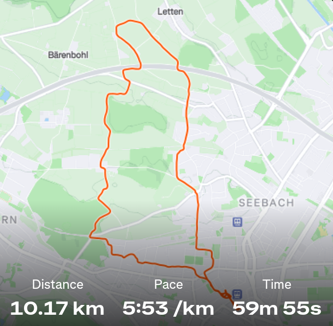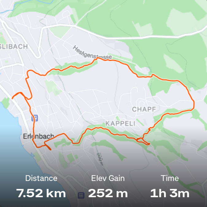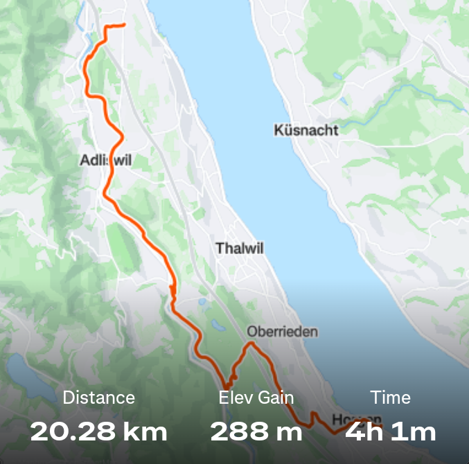 11 October 2025 - Kemptnertobel - 8 km 7 October 2025 - Oerlikon - 13 km Paula often joins me for evening group runs, but tonight going up the Zürichberg in the dark I lost her. She runs with us unleashed through the forest and often goes on sidequests, but always rejoins us. Except tonight. Tonight a woman found her and leashed her and called the police. Nevermind that I let the group go on without me and spent an hour calling for Paula in the forest. She was down by a farm at the edge. Picking her up at the police station later we were both relieved, but Paula couldn't understand where the rest of the group was. ![]() 6 October 2025 - Adetswil - 1 km hike & 4 km run 5 October 2025 - TrailRun Einsiedeln - 17 km ![]() 4 October 2025 - Erlenbach - 9 km hike 2 October 2025 - Horgen - Richterswil - 13 km hike Between the lakeshore and the trainline; what a constrast with yesterday! ![]() 1 October 2025 - Wollishofen - Horgen - 20 km hike Up and over the hill to the Sihl River valley. Then follow the Sihl upstream to the Sihlwald. After that it's up and along the hill above the Zürichsee until descending to it at Horgen. ![]() 30 September 2025 - Oerlikon - 10 km ![]() 29 September 2025 - Adetswil - 2 km 28 September 2025 - Pfäffikerseelauf - 12 km ![]() 26 September 2025 - Erlenbach - 6 km 25 September 2025 - Erlenbach - 8 km ![]() 22 September 2025 - Erlenbach - 3 km 21 September 2025 - Adetswil - 3 km ![]() 20 September 2025 - Greifenseelauf - 21.1 km ![]() ![]() 17 September 2025 - Zürich - 7 km ![]() 14 September 2025 - Unterägeri - Zug - 16 km 13 September 2025 - Adetswil zum Pfäffikersee - 6 km 11 September 2025 - Wetzikon - 9 km ![]() 9 September 2025 - Oerlikon - 10 km ![]() Today I signed up to run the Greifenseelauf again, so I started this training schedule to plan ahead for the rest of 2025. |