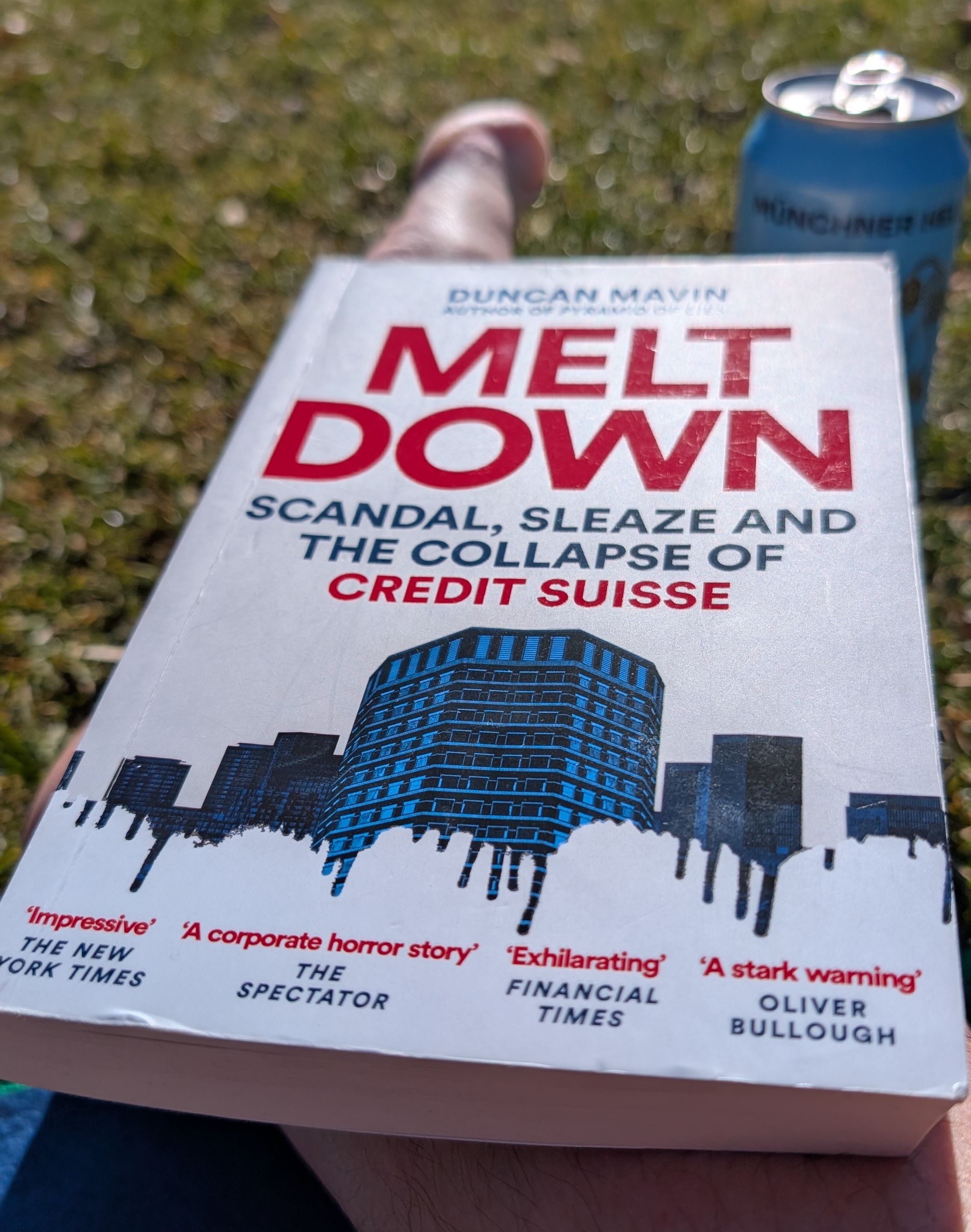 20 February 2026 - Erlenbach Credit Suisse's was the first big financial collapse that happened in Switzerland after I moved here. Although based it Zürich, it was quite international by then. Duncan Mavin's Meltdown tells this tale and some of the history of the firm that preceded it. We get the story of the founder, Alfred Escher, and his creation of a bank to finance the building of Swiss railroads in the 19th century. Escher, sadly, comes to a scandelous end as to many of the Credit Suisse characters in Mavin's book. I wonder how much this really has to do with Credit Suisse having had a particularly corruptable culture (as Mavin asserts), or if it has more to do with Mavin's experience as a financial journalist leads him to look for scandels. And looking through the book's citation one realizes that they're nearly all from English language sources despite the bank being based in the German-speaking part of Switzerland. Scandals do make great stories though, and Credit Suisse's end was ignomenious enough for an journalist to salivate over. If Mavin had just wrote about this final death blow, then that would have been one thing, but chapter after chapter of the book is just about one scandal after another without giving a broader picture of the bank's development. This left me somewhat disappointed, although it's not too unusual for the genre. I did enjoy some of the bits where Zürich's local color shone through though.