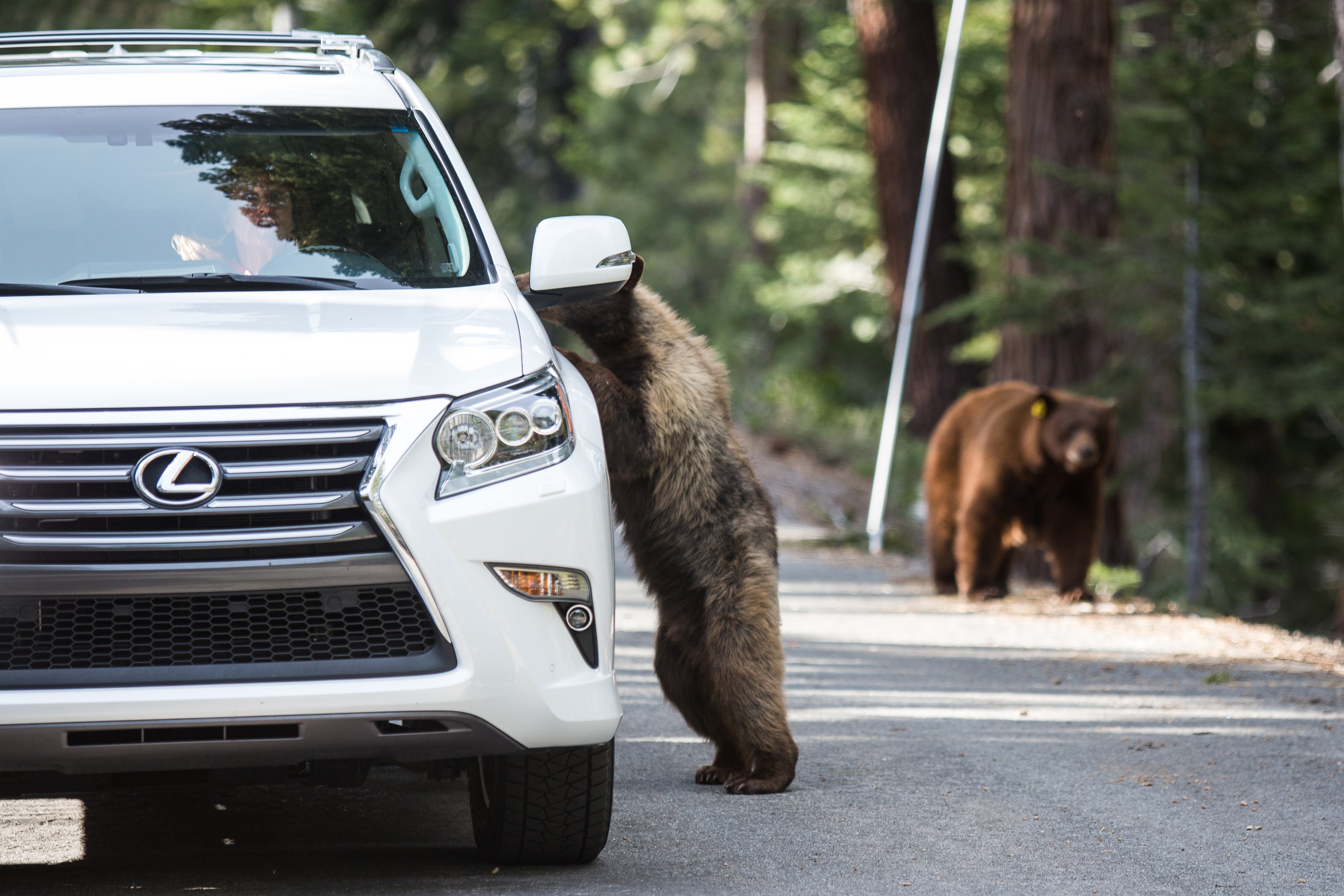 The reflection from the black bear's eyes is visible in the tree A decade earlier on the other side of the continent in the Smokies I had my closest encounter with a black bear. In the fading light hiking back from Abrams falls with Zara on my front, Maxwell on my back, and Molly on a leash, a black bear heading down to the creek passed 30 feet in front of us. Fortunately Molly was fairly blind by this point and didn't bark. I backtracked to the twins and my wife to warn them and wait for the bear to get down to the creek. A family was mauled near this area a few weeks later, so we were lucky. My Auntie Dell, who lives on Lake Tahoe, has to deal with brown bears which are not actually brown bears, but brown colored black bears. Confusing? Not at all. She has to keep her trash locked up and be careful with her dogs. Still they come. And we probably saw a grizzly bear (one of the brown bear subspecies) across a field in Yellowstone back in 2015, but it was quite far away so the pictures are too grainy to tell.