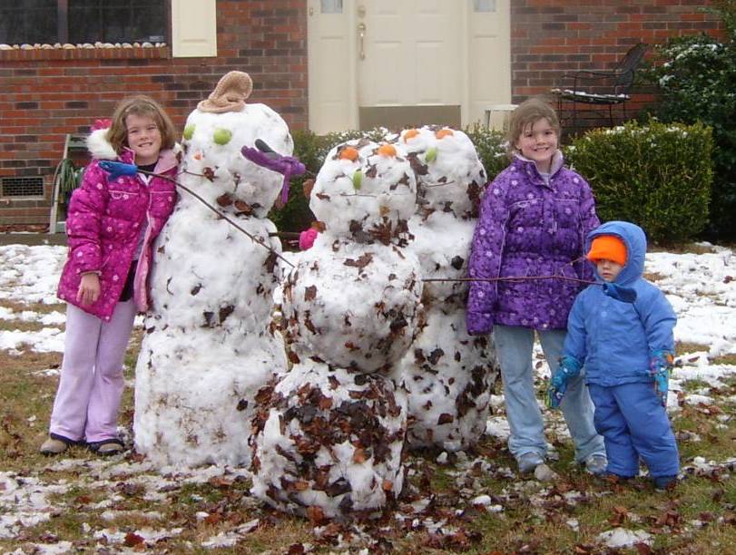 Our snowmen and their constructors. Later they were cannibalized to build a snowfort.