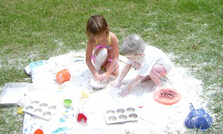 The Messy Party was everything one could hope it to be - a big mess: Children flinging paint at eachother with wanton disregard; Mud being slathered on bodies like sunblock; Flour caking up on the trampoline as wet rapscallions jumped amongst it. Oh, it was at the same time a beautiful and terrible thing to behold. Smiles of those freed from the shackles of all youth's inhibitions, and the disgusting mess that they wrought upon the backyard. If not for the rain and thunder that ended it all, society itself might have fallen apart right then and there.