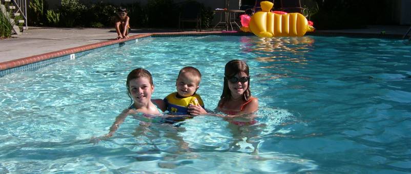 Zara, who is now walking alot, really enjoys the pool. Yesterday afternoon she practiced getting in and out, in and out, in and out at the steps. She only fell in once, but Brittan fished her out before her her sun bonnet even got wet. Maxwell, on the other hand, mainatins a conservatively safe distance from the pool most of the time. He will put his feet in if the concrete is hot, but full immersion is out of the question. There are so many kids running around most of time that the place is a little zooey - more than ten other kids in our building alone, the majority of which seem to be elementary aged girls. This coupled with the renewed presense of our nice soft bed has led Cara to decide that she likes our new apartment after all, even if I did make her cry carrying Nancy's old couch up the stairs to apartment yesterday.