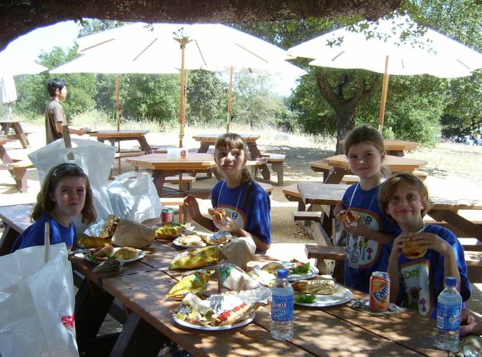 Bring your daughter to work day is a little wild here at SLAC ... Basically it's like a day long science camp where the kids get to chose a set of activities to do. The girls chose option C because it included building a catapult. We started the day off by going to breakfast and then heading up to SLAC. There are ~250 kids here today so it is really a zoo. After registration, we played frisbee on the lawn before they headed off to a lecture and I to a meeting.  |