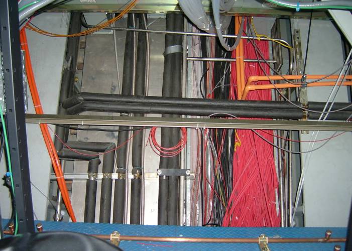 BaBar has been down for a little over a week now, and today I got my first play at the detector. At right is a view above the SOB, where the Cherenkov cone from the DIRC expands before being recorded by the PMTs. Today, however, I worked mostly on cabling for the LSTs. If you ever build a high energy particle detector, do it right the first time so you don't have to replace anything. The LSTs are being put in to replace the malfunctioning RPCs for the last few years of datataking, but retrofitting a detector into BaBar is really quite a pain.  |