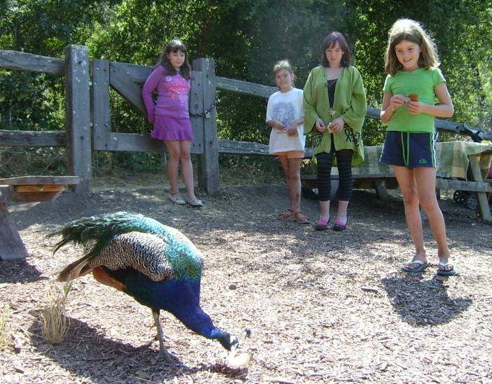 Today was very exciting, because we met Jewelie Randall and her family. Jewelie is my 10th cousin and discovered Wogsland.org last summer. This summer she and her family just happened to be vacationing in California not long after we moved out here, so we met for an afternoon at the Picchetti Ranch just 15 minutes west of us in Cupertino. We knew they'd be fun when we saw Jewelie's husband Andy and he was wearing a beard, Hawaiian shirt and Tevas. We drank alot of wine and had alot of fun - Athena hit it off right away with Alora & Brittan and they dammed up the creek and picked berries while Kaliska played with Zaraboodle and we tasted wine. You will note Maxwell is holding bologna in the picture to the right - he was stung on his wrist by a yellow jacket that wanted his bologna just afterward. He pulled through though, and now we at least know he's not allergic to bee stings. Maxwell also got nipped while the kids were feeding the peacock; I guess it just wasn't his day! Nevertheless, our cousins were alot of fun and we were sad to see them go. Hopefully we will have a chance to visit them in Portland before we move back east.  |