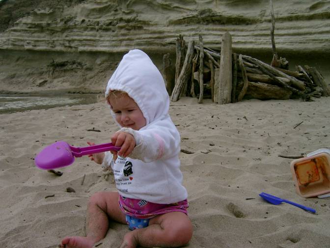 "Ba, ba, ba. Eee, eee, ha!" says Zara as she waddles full-diapered carrying her bucket across the room.