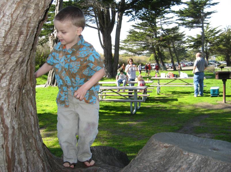 Maxwell climbs a tree while we picnic at Stinson Beach.